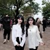 The photo features a person with long dark hair standing against a solid light blue background. They are wearing a black top adorned with small white specks and a front tie detail. One arm is raised, with the hand placed horizontally across the forehead, as if shielding their eyes or striking a pose. The lighting is bright and even, and the subject is centered, creating a clean and visually balanced composition.