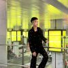 The image features a fashionable individual standing confidently on an elevated walkway inside a bustling, modern transportation hub—likely an airport or train station. They are dressed in a black outfit adorned with colorful patterns and paired with white sneakers. The ceiling above glows with vibrant yellow lighting panels, creating a dynamic atmosphere. Multiple digital screens display bright yellow advertisements, one of which reads “THÁNG 06.06.06.06.” Below the platform, a busy urban street scene unfolds, visible through the glass barrier, with vehicles and pedestrians adding to the lively energy of the setting. The photo captures a blend of personal style and urban movement.